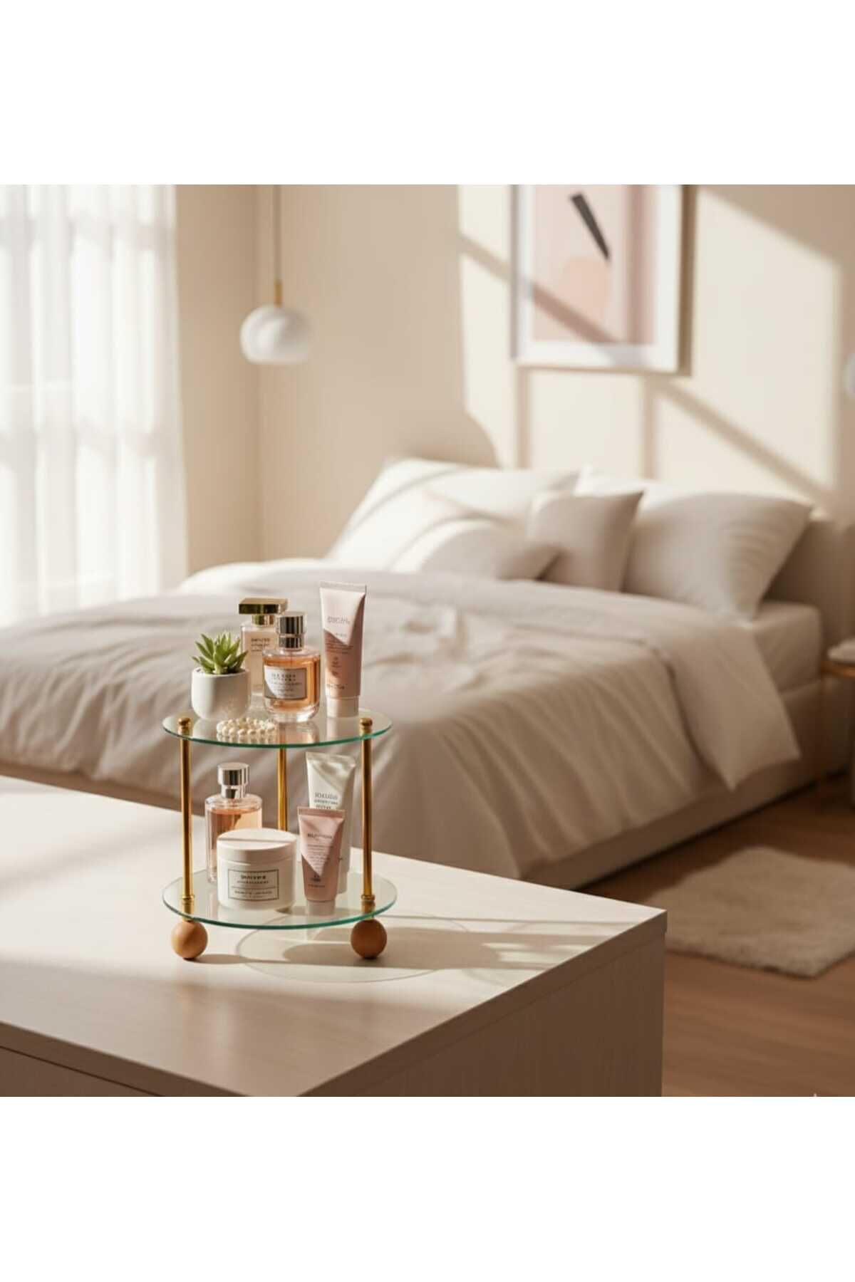 1 Adet 2 Katlı Yuvarlak Ahşap Ayaklı Vidalı Cam Organizer (25 x 25 cm)