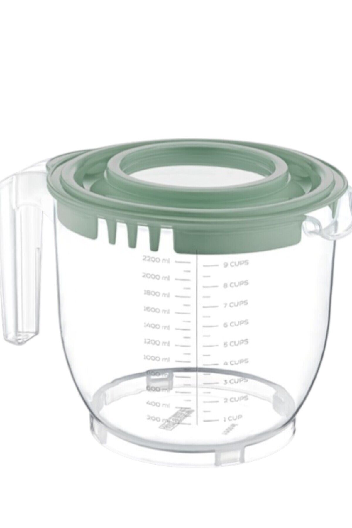 - Geniş kapasitesiyle 2200 ml hacme sahip, büyük miktarlarda malzemeleri kolayca karıştırmanızı sağlar.; - Kapağı sayesinde içeriği dış etkenlerden korur ve temizliği pratiktir; böylece hijyenik bir kullanım sunar.; - BPA içermez özelliği ile sağlığınızı düşünerek tasarlanmıştır; güvenle gıda hazırlıklarınızda kullanabilirsiniz.; - Ölçü kabı olarak da kullanılabilen bu ürün, mutfakta ihtiyacınıza göre farklı ölçülerde malzeme eklemenize olanak tanır.; - Sağlıklı ve pratik tasarımıyla mutfak işlerinizi daha keyifli hale getirirken zamandan tasarruf edersiniz.;