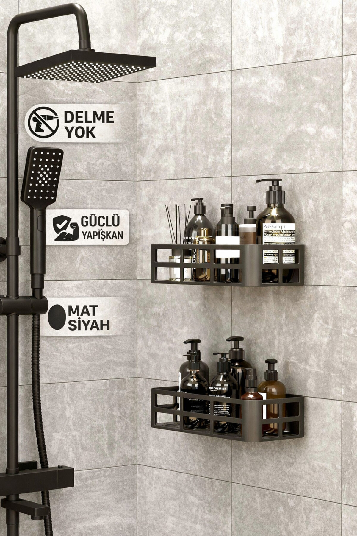 2Lİ Set Banyo Duş Rafı Şampuanlık Sabunluk Siyah YAPIŞKANLI Duş Organizer Suya Dayanıklı Plastik