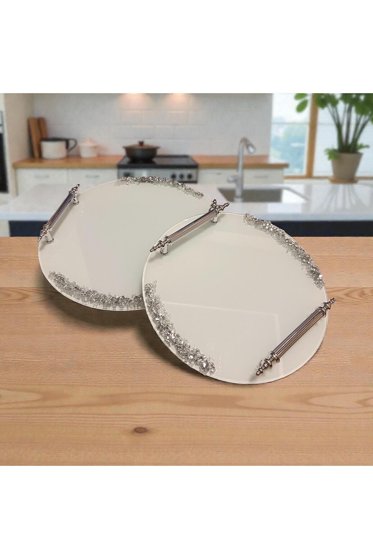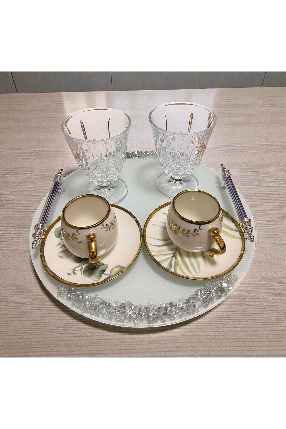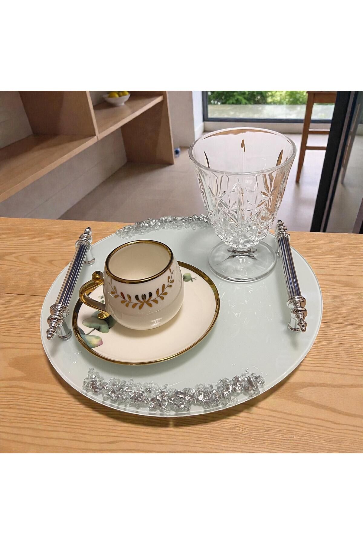 2’li Söz & Nişan Yüzük-Kahve Servis Tepsi Seti | Silver Yaldızlı Krom Kulp | Yuvarlak Cam Tasarım