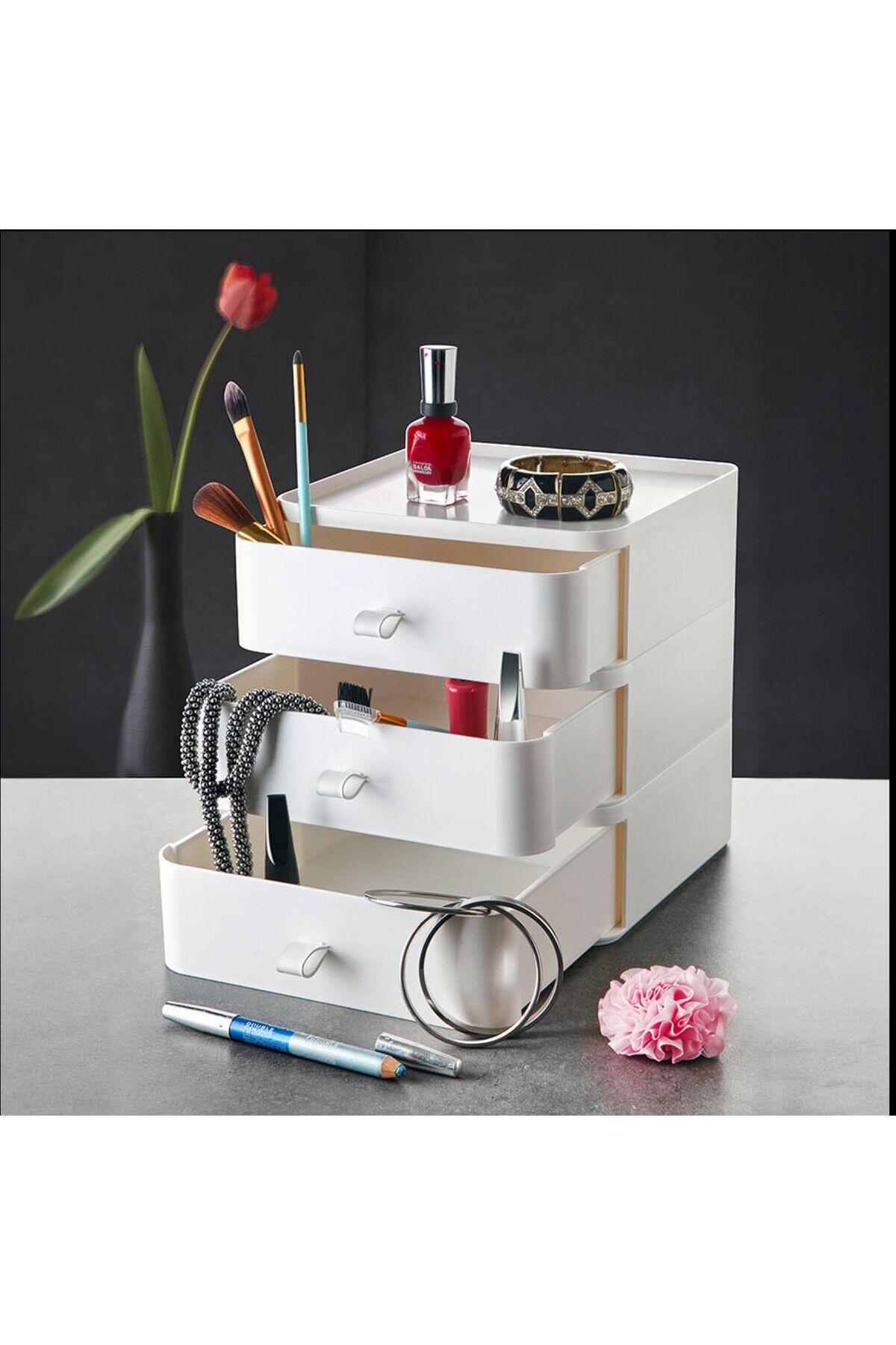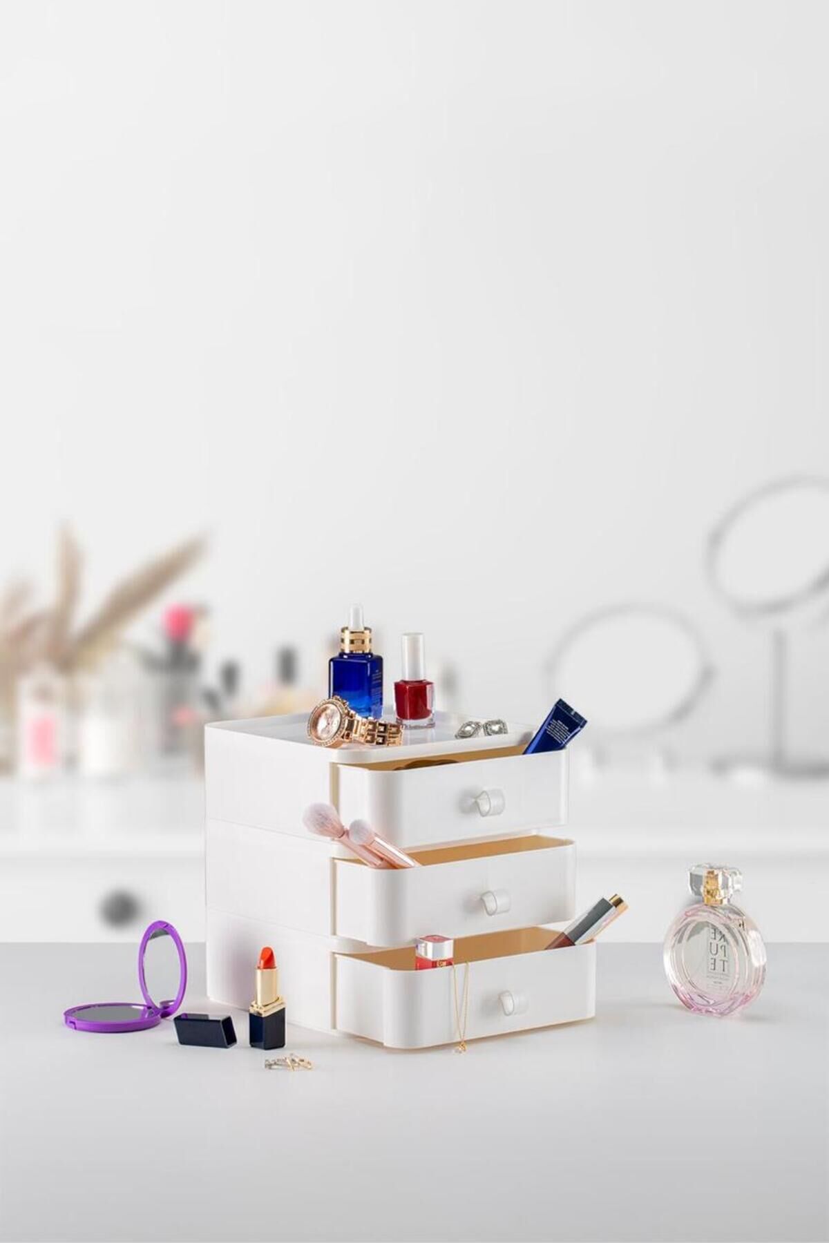 3 Katlı Çekmeceli Masaüstü Organizer – Makyaj, Takı ve Aksesuar Düzenleyici