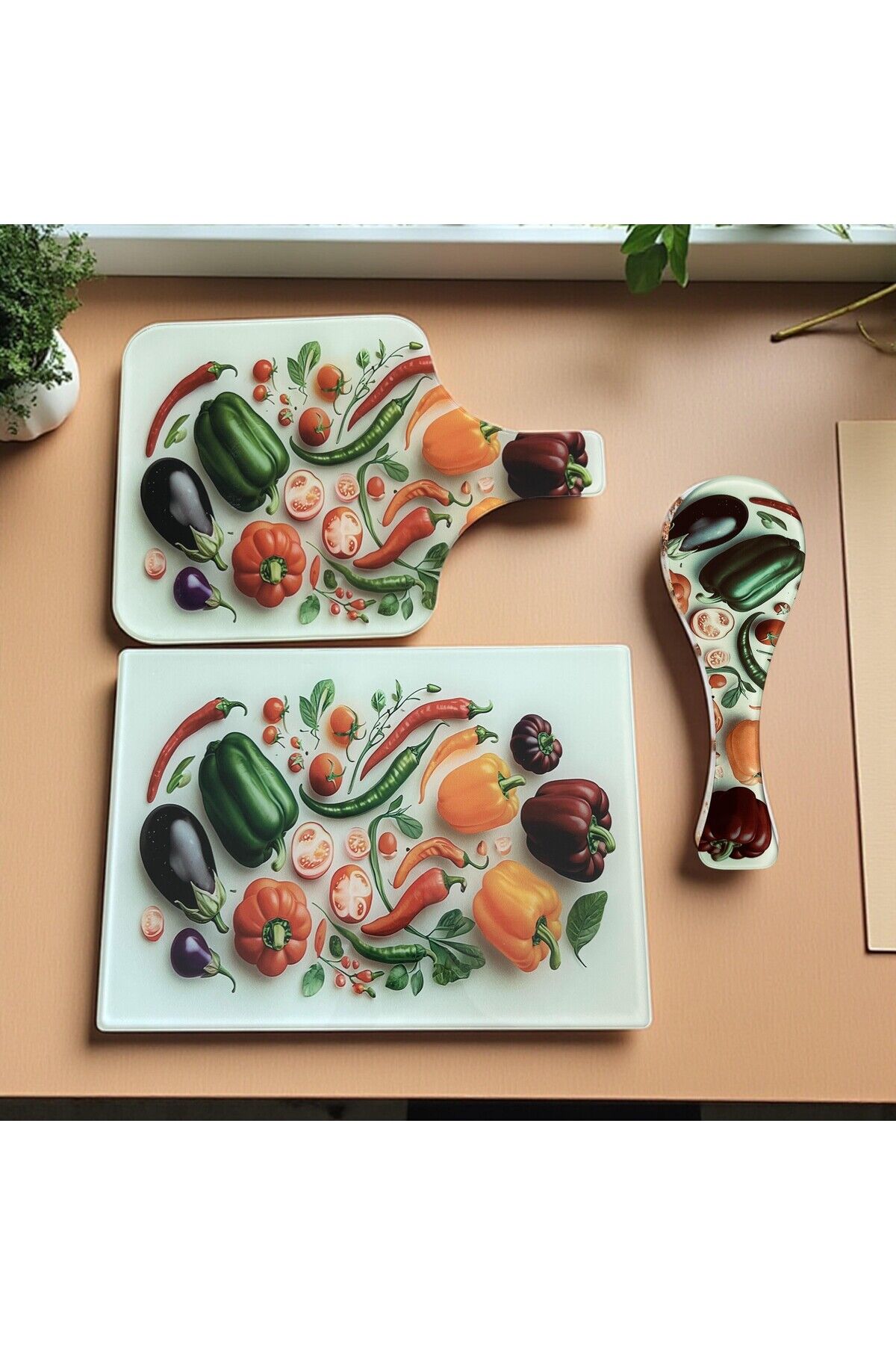 3'lü Set Temperli Cam Sebze Meyve Doğrama Kesme Tahtası + Yedek Silikon Ayak