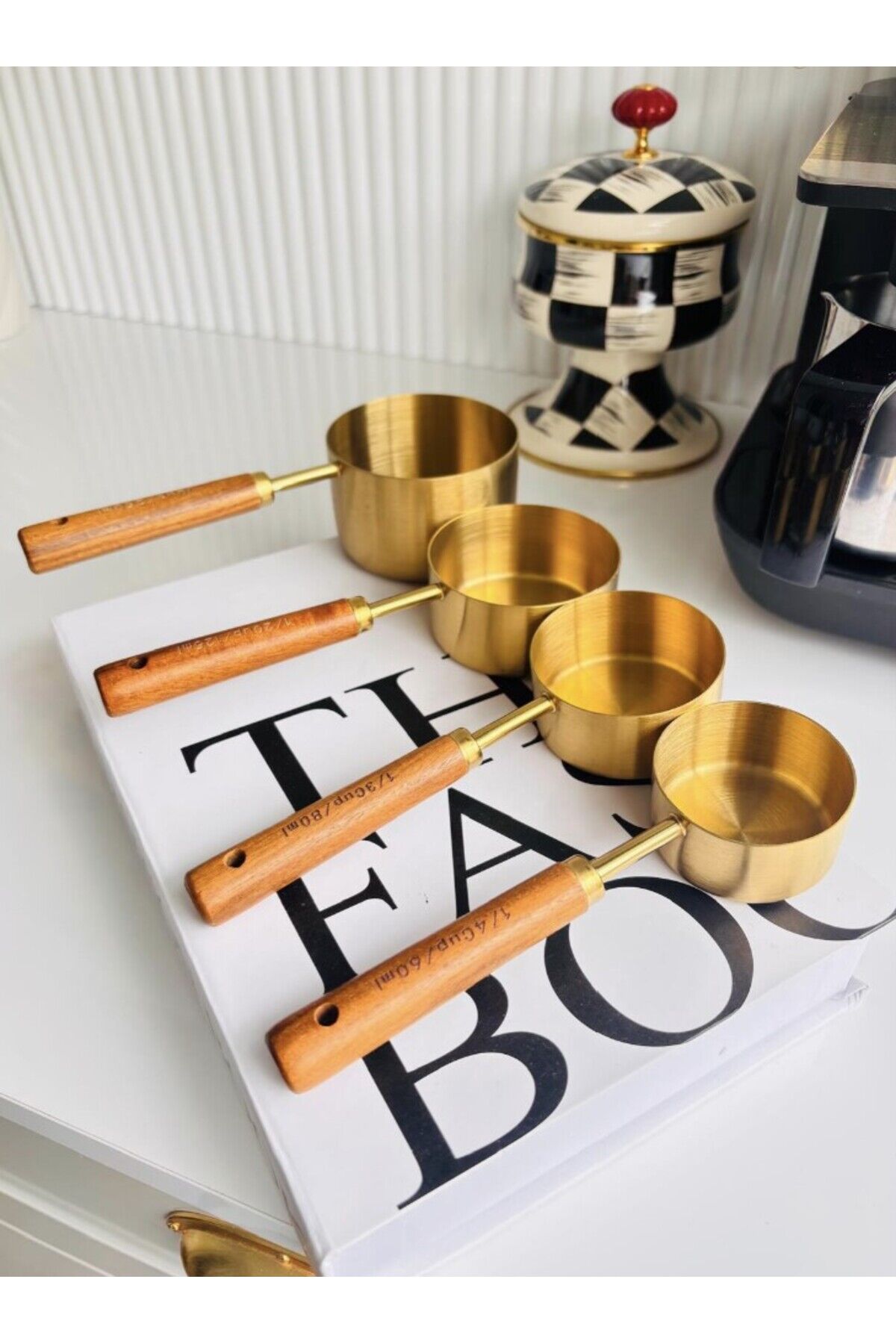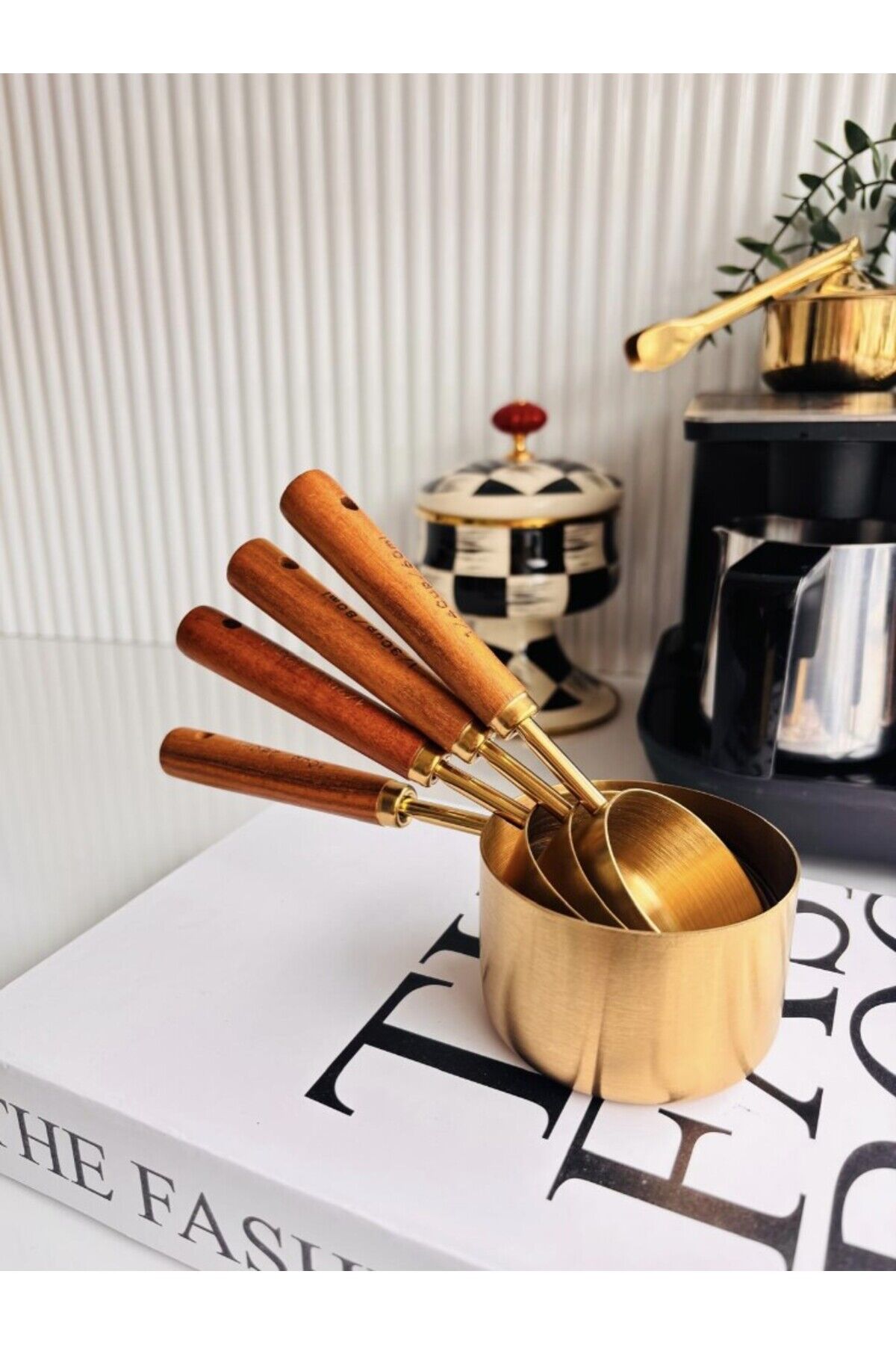- Otantik tasarımıyla dikkat çeken bu ölçü kaşıkları, mutfakta şıklığı ve işlevselliği bir arada sunar.; - 4 farklı boyutta (60ml, 80ml, 125ml, 250ml) olan bu set, çeşitli ölçüm ihtiyaçlarınıza uygun çözümler sağlar.; - Dayanıklı çelik malzemesi sayesinde uzun ömürlü kullanım vaat ederken, kolay temizlenebilir yapısı pratiklik kazandırır.; - Altın rengi detaylarıyla göz alıcı bir görünüm sergileyen bu ölçü kaşıkları, mutfak dekorasyonunuza zarif bir dokunuş ekler.;