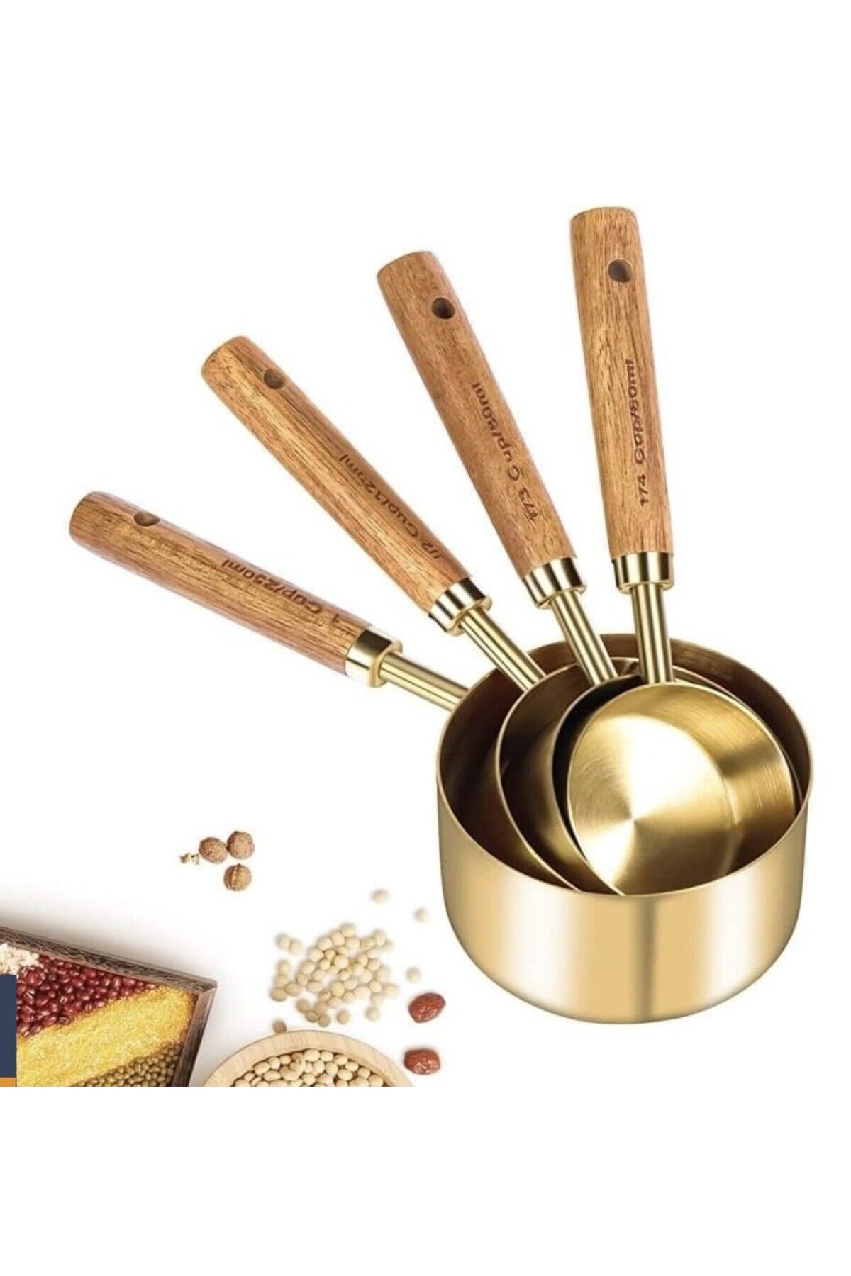 4'lü Çelik Otantik Ahşap Saplı Ölçü Kaşığı Seti Ölçü Kabı Gold Renk 60ml 80ml 125ml 250ml