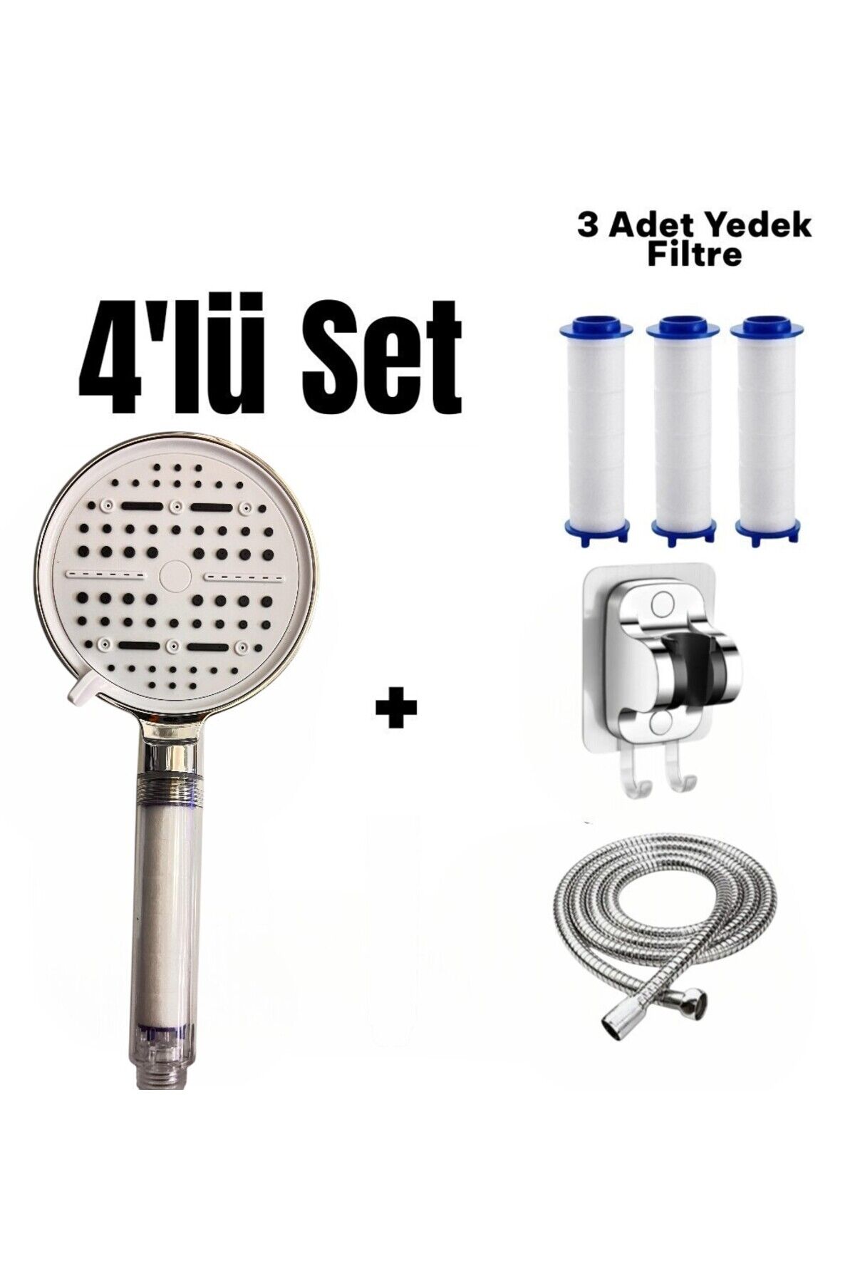 4'lü Set Masajlı Filtreli Duş Başlığı +Yapışkanlı Mafsal Askı+ Örgülü Hortum+3 Adet Yedek Filtre