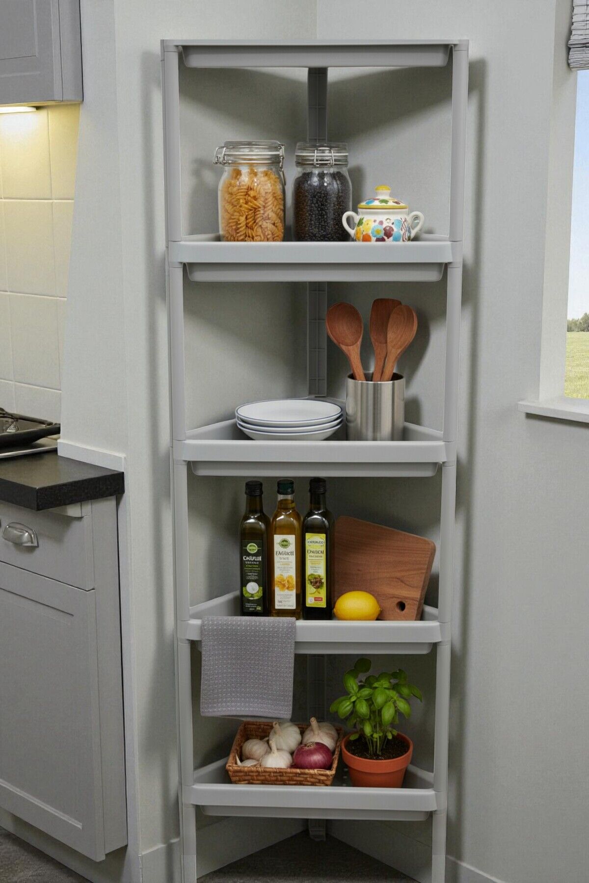 5 Katlı Üçgen Raf Ünitesi – Köşe Alanlar İçin Şık ve Fonksiyonel Depolama Çözümü Mutfak Banyo Salon