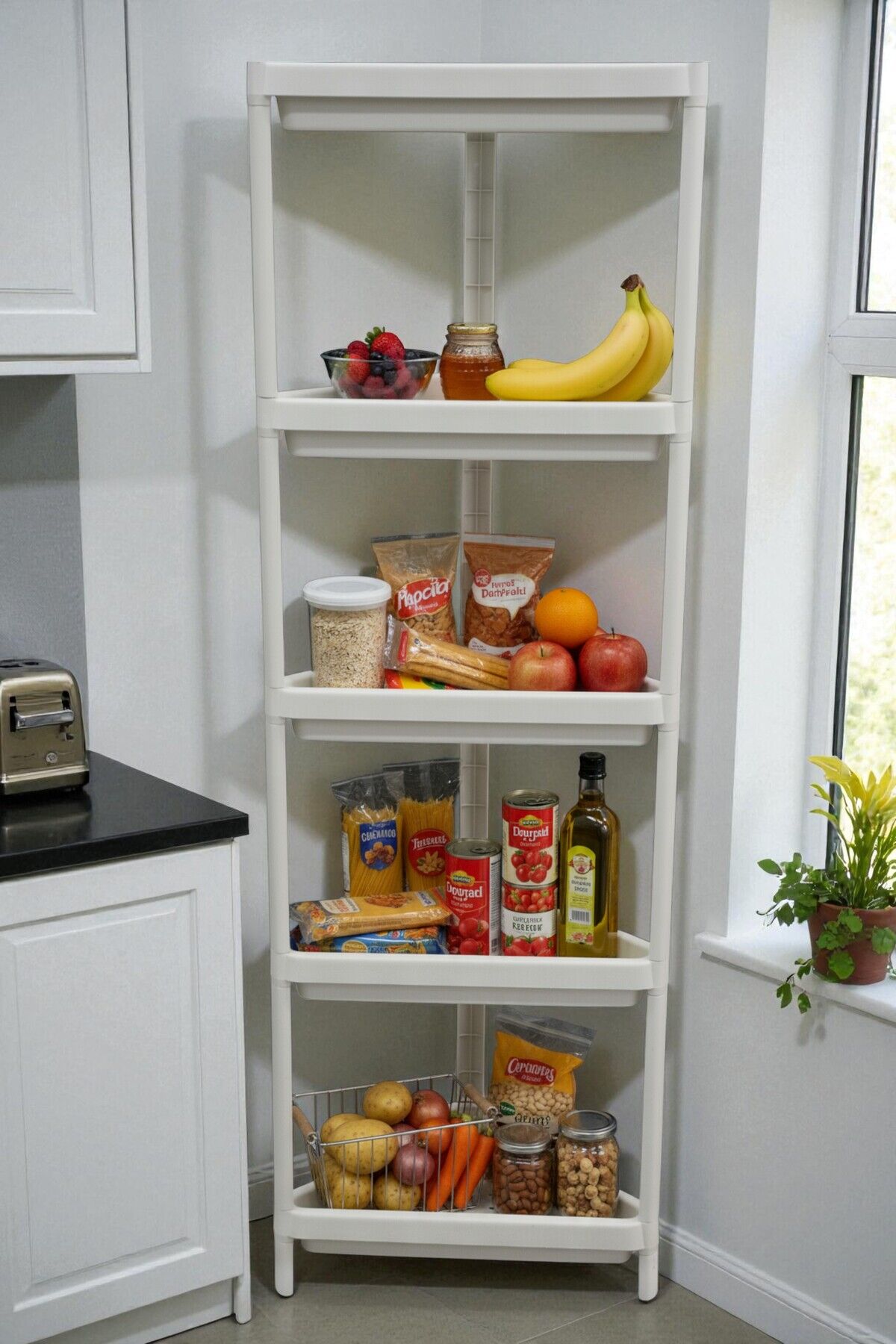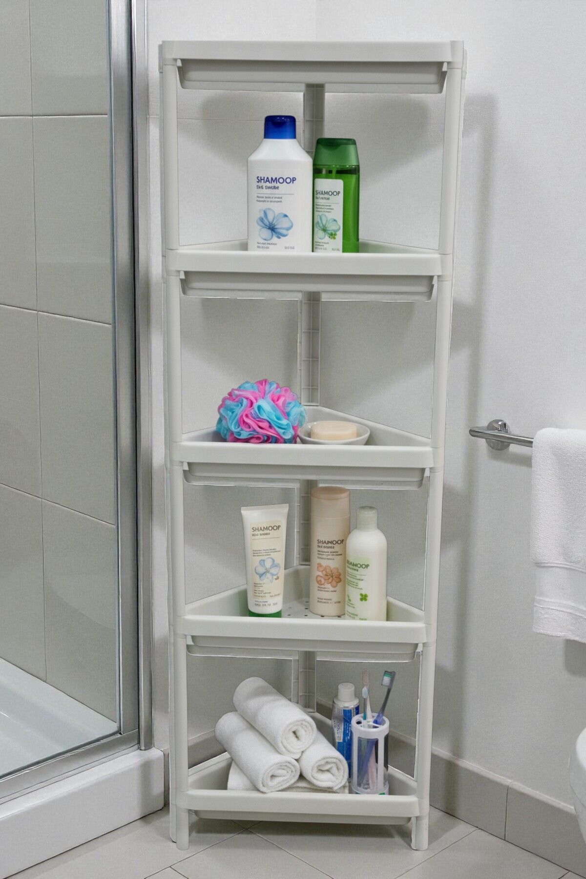 5 Katlı Üçgen Raf Ünitesi – Köşe Alanlar İçin Şık ve Fonksiyonel Depolama Çözümü Mutfak Banyo Salon