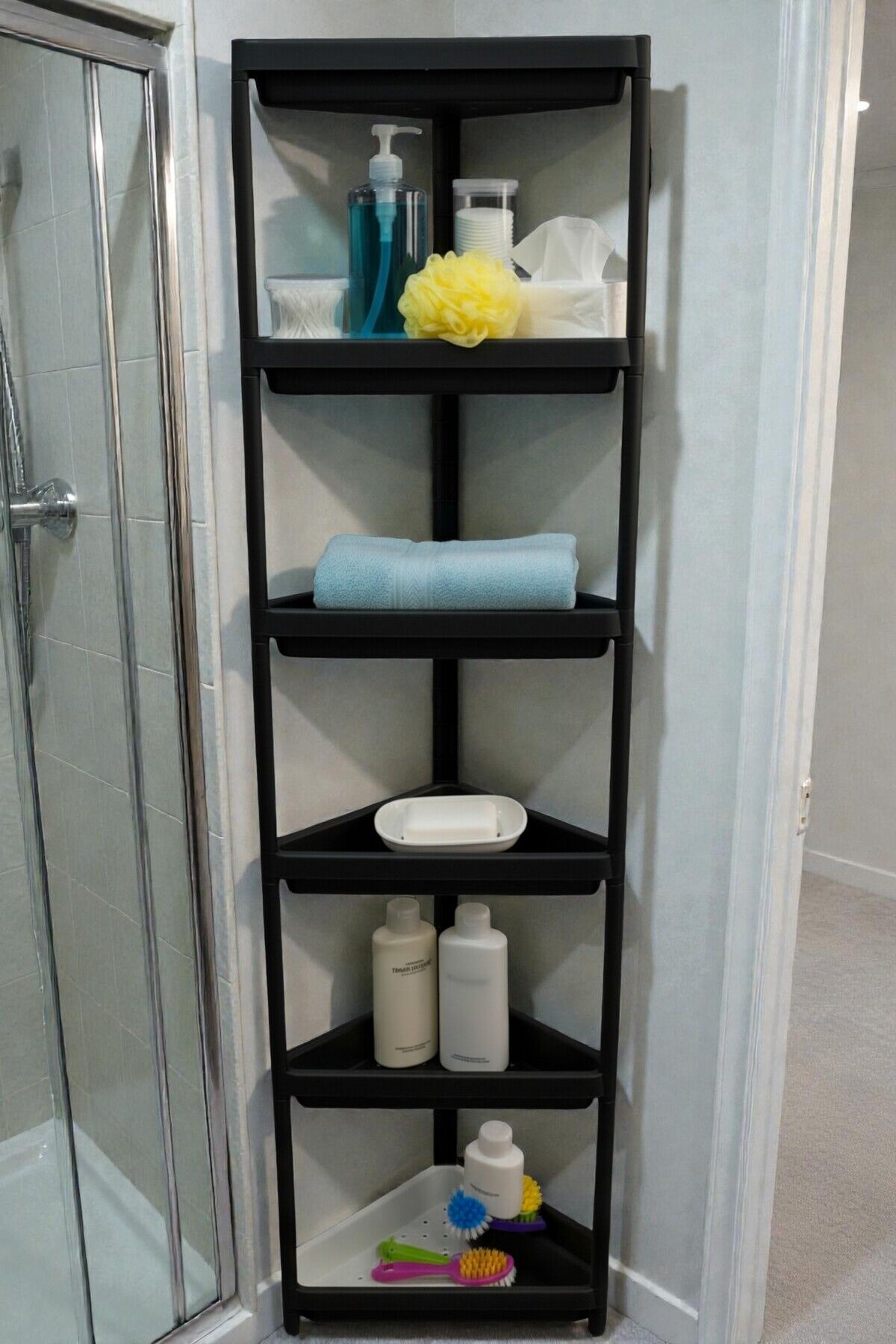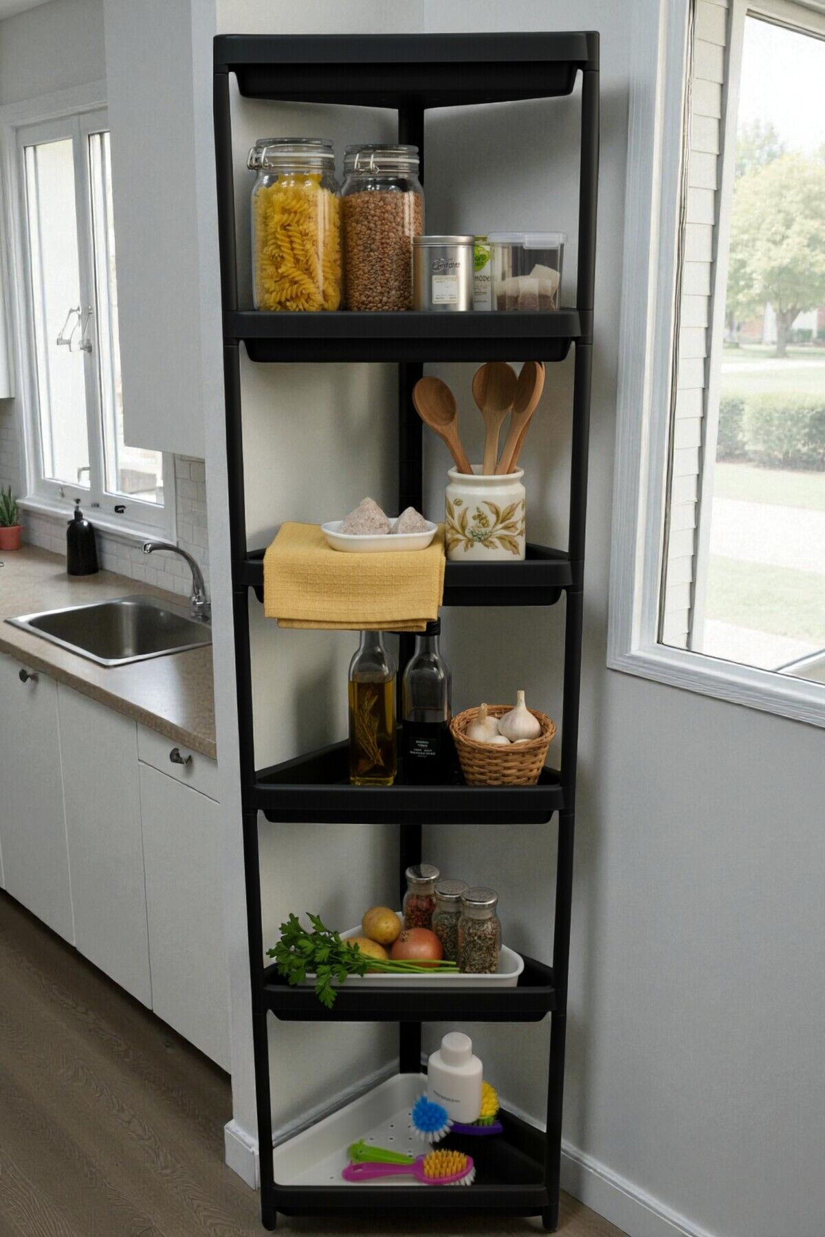 6 Katlı Üçgen Raf Ünitesi – Köşe Alanlar İçin Şık ve Fonksiyonel Depolama Çözümü Mutfak Banyo Salon