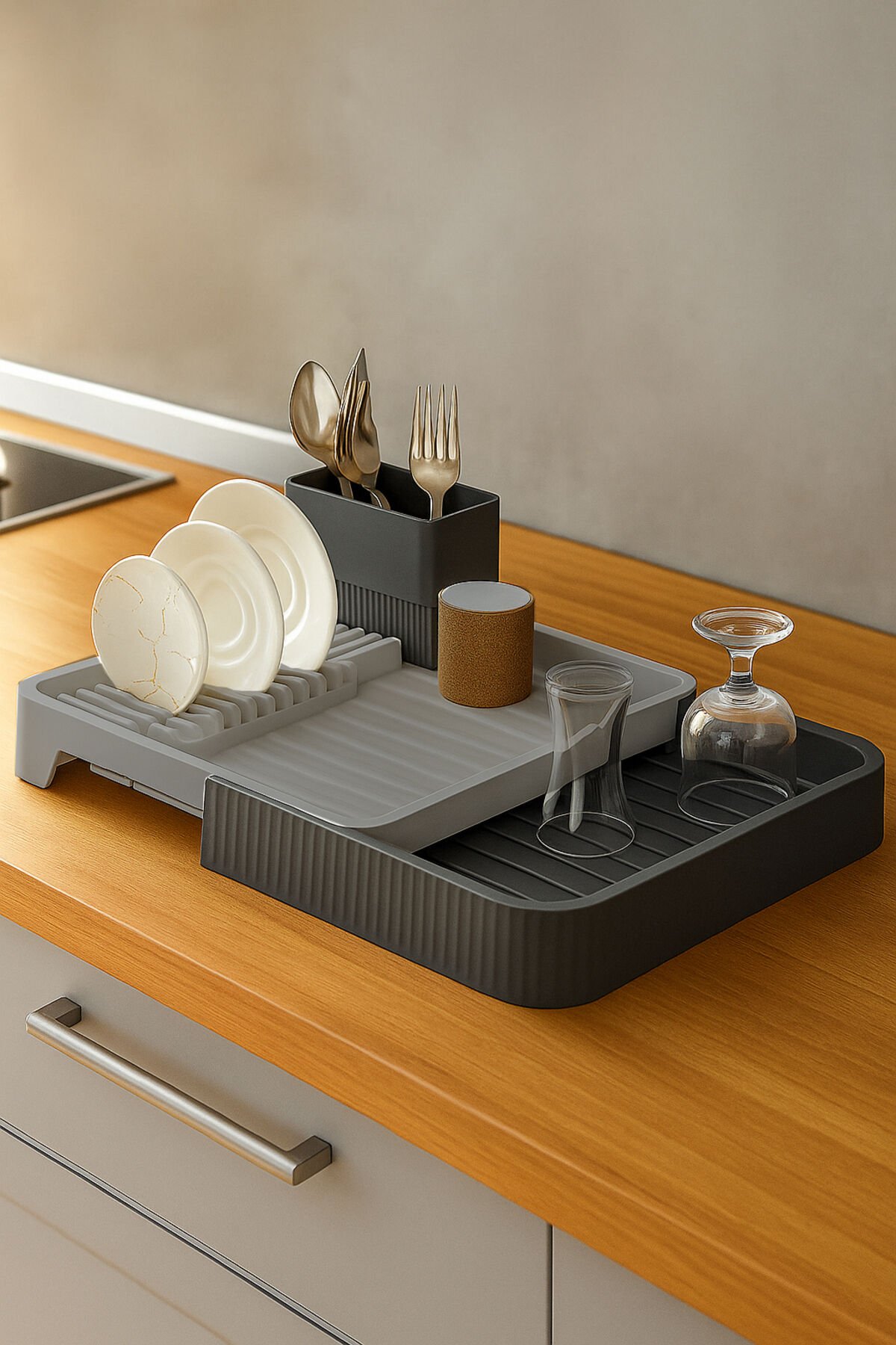 Açılır Kapanır Sürgülü Bulaşık Kurutma Sepeti Tabak Kaşıklık Su Tahliyeli Bulaşıklık – Antrasit Gri