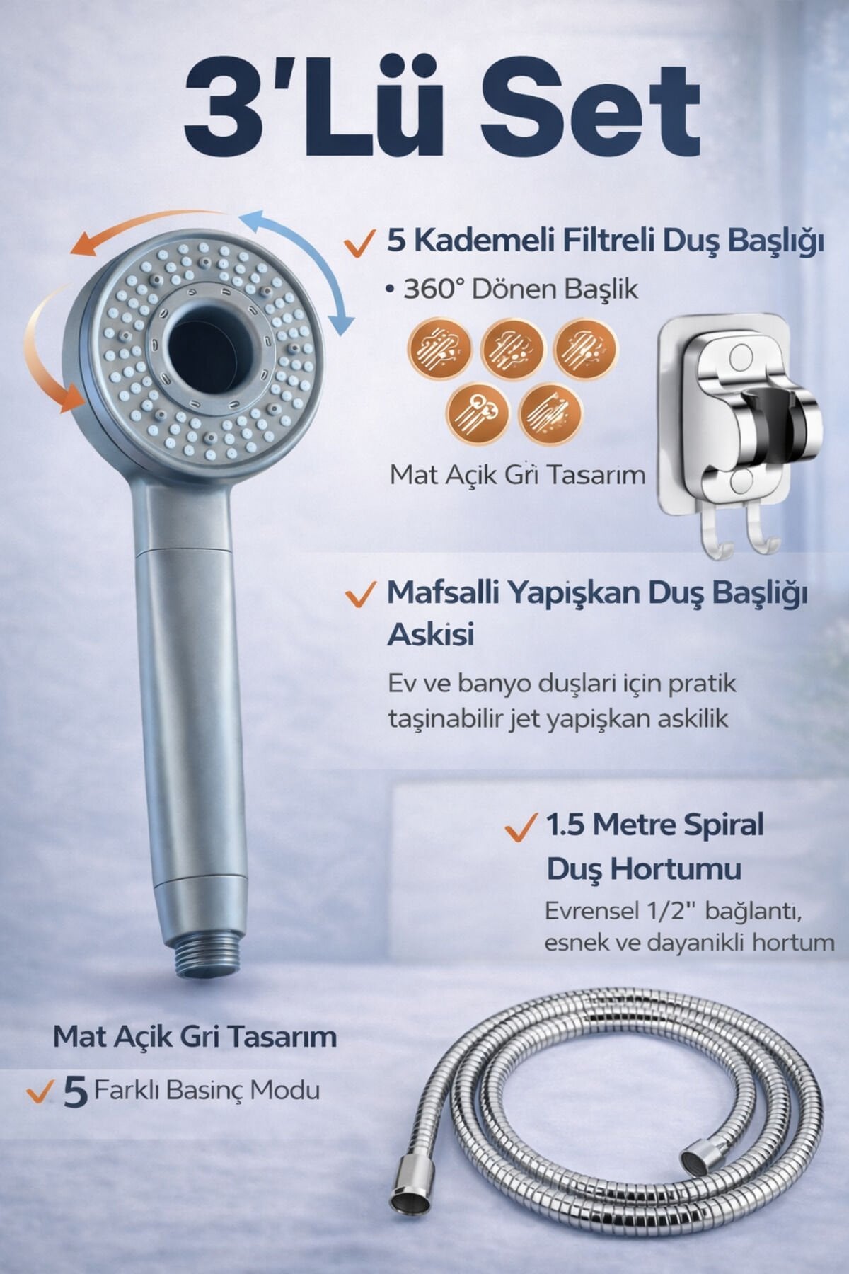 3’lü Set Filtreli Duş Başlığı – Yüksek Basınçlı, Mafsallı Yapışkan Askı + 1.5 m Duş Hortumu Banyonuzda konforu ve pratikliği bir arada sunan 3’lü duş seti, güçlü su akışı ve fonksiyonel tasarımıyla günlük duş deneyiminizi üst seviyeye taşır.; Delme gerektirmeyen yapışkanlı askısı ve esnek hortumu ile kurulumu kolay, kullanımı rahattır.; ⭐ Set İçeriği ✔ 1 Adet 5 Kademeli Filtreli Duş Başlığı ✔ 1 Adet Mafsallı Yapışkanlı Duş Askısı ✔ 1 Adet 1.5 Metre Spiral Duş Hortumu