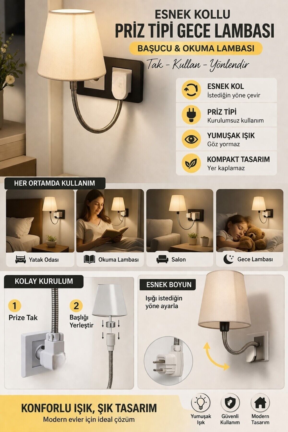 Esnek Kollu Priz Tipi Gece Lambası – Başucu & Okuma Abajuru, E14 Duy, Dekoratif Duvar Lambası