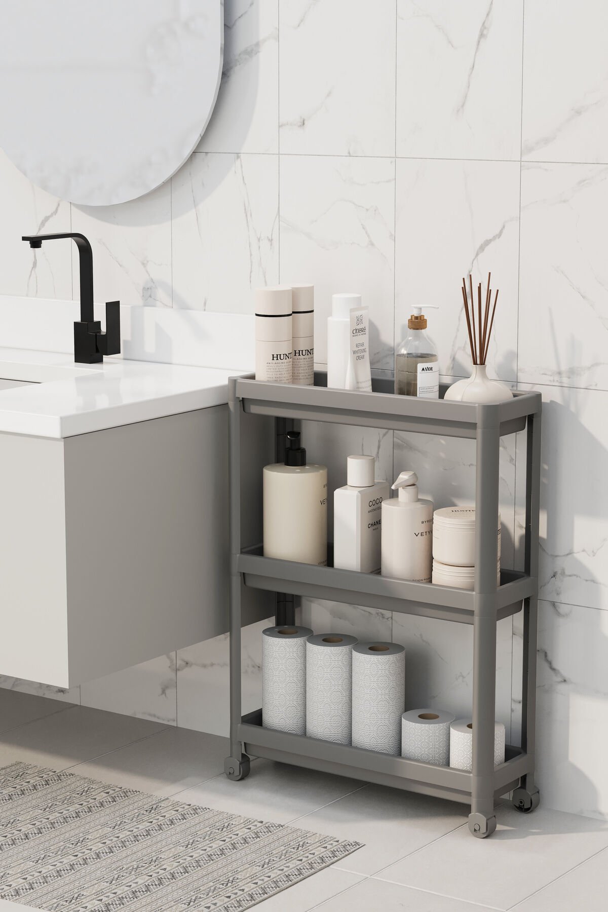 Gri Tekerlekli Dikdörtgen 3 Katlı Raf Ünitesi - Banyo Mutfak Düzenleyici Organizer Raf(GRİ)