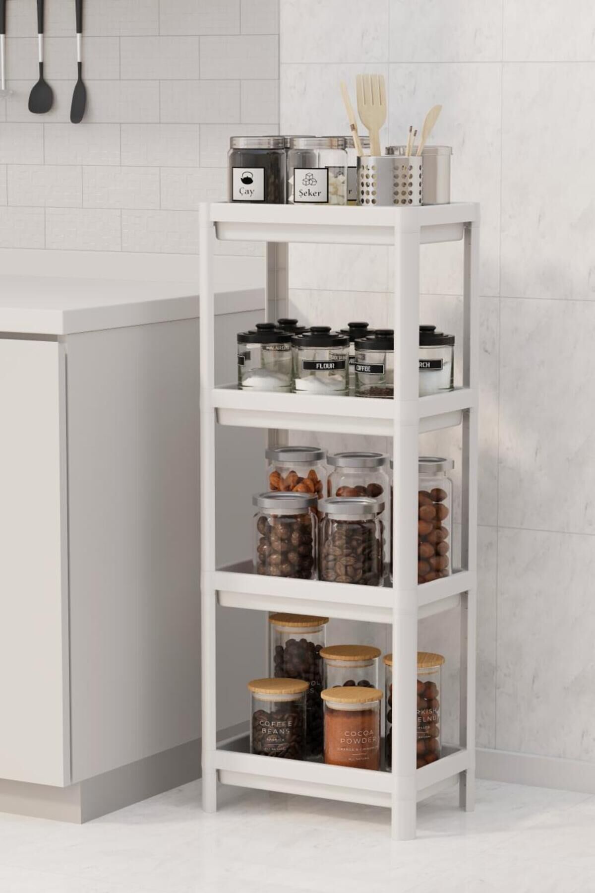 MAGGIE 4 Katlı Banyo & Mutfak Raf Düzenleyici Ünite – Şampuanlık, Havluluk, Dolap ve Organizer ; Çok amaçlı kullanım: Kitaplık, banyo rafı, mutfak düzenleyici, çiçeklik ve daha fazlası için uygundur; Şık ve modern tasarım: Beyaz rengiyle sade, zarif ve dekoratif bir görünüm sunar; Dayanıklı malzeme: Yüksek kaliteli plastikten üretilmiş olup kırılma ve bükülmelere karşı dayanıklıdır; Geniş depolama alanı: 4 katlı yapısı sayesinde ihtiyacınıza göre düzen sağlar; Kolay kurulum: Aletsiz, pratik montaj sistemiyle dakikalar içinde kurulabilir; Yüksek taşıma kapasitesi: Her raf 20 kg’a kadar ağırlık taşıyabilir; Kompakt boyutlar: 100 cm yükseklik, 38 cm genişlik, 29 cm derinlik ve 24 cm raf arası mesafe; Çok yönlü kullanım: Banyo, mutfak, salon, balkon veya ofiste düzenleyici olarak idealdir; Yerli üretim: Türkiye menşeilidir, kaliteli ve çevre dostu üretim standartlarına sahiptir.