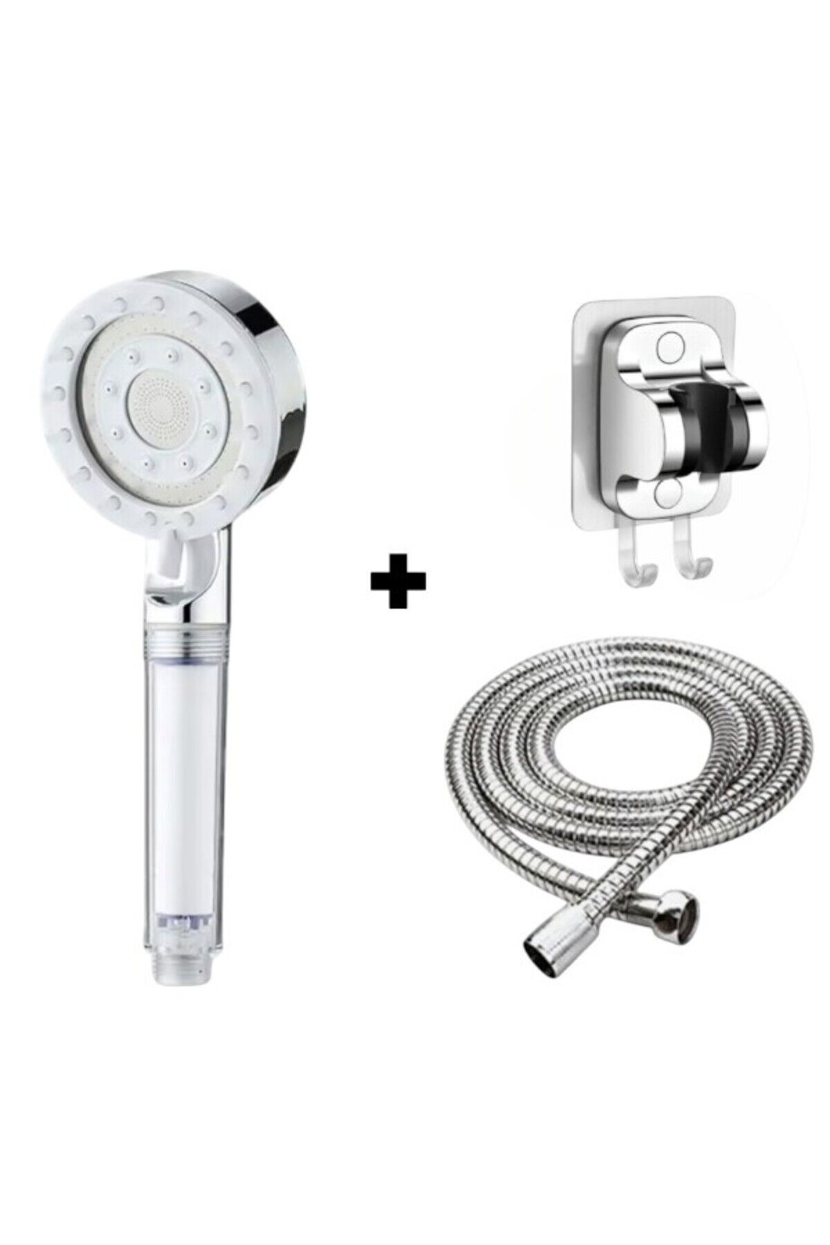 Masajlı Filtreli Gri Duş Başlığı +Kendiliğinden Yapışkanlı Mafsal (Askı) + 150 cm Örgülü Hortum
