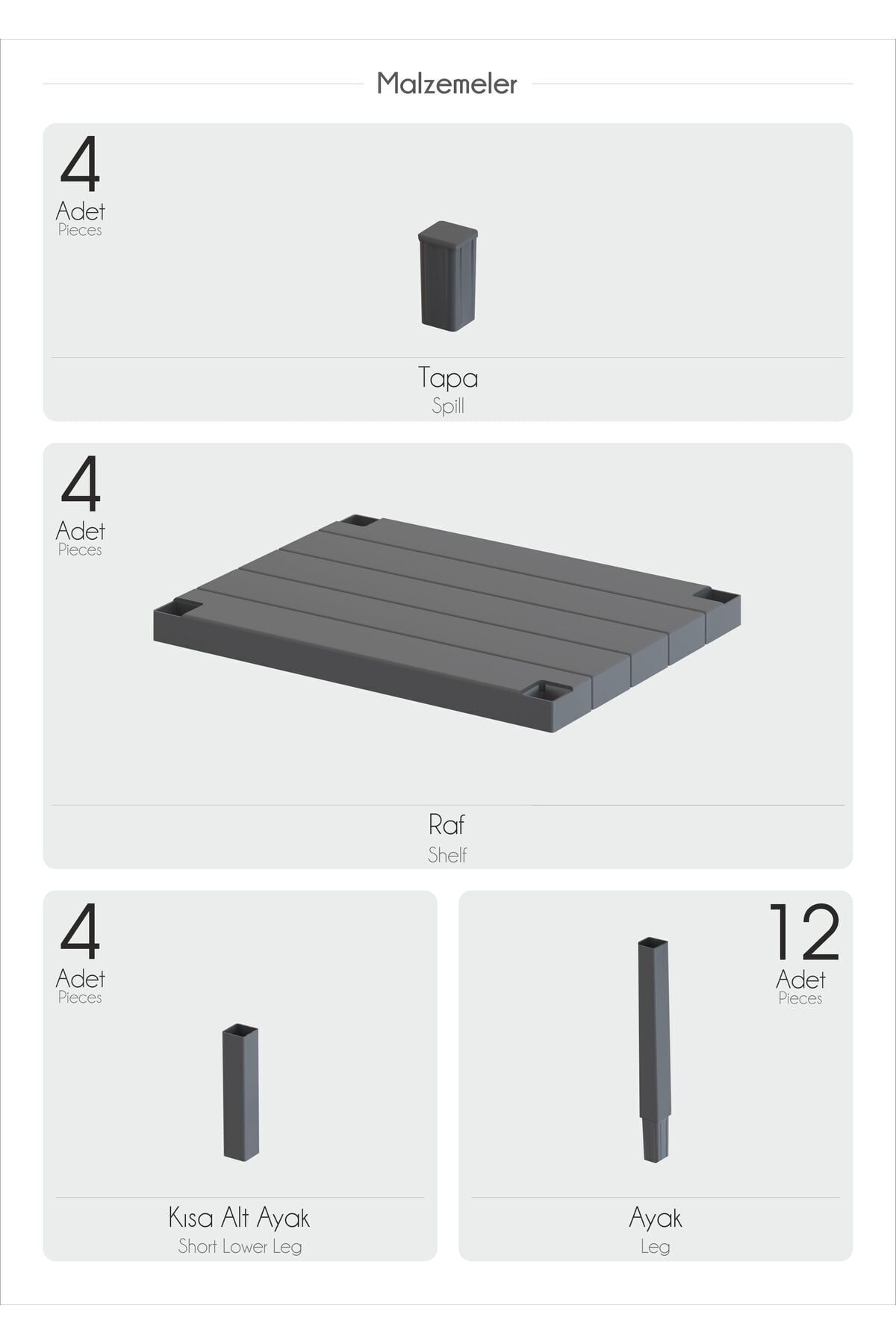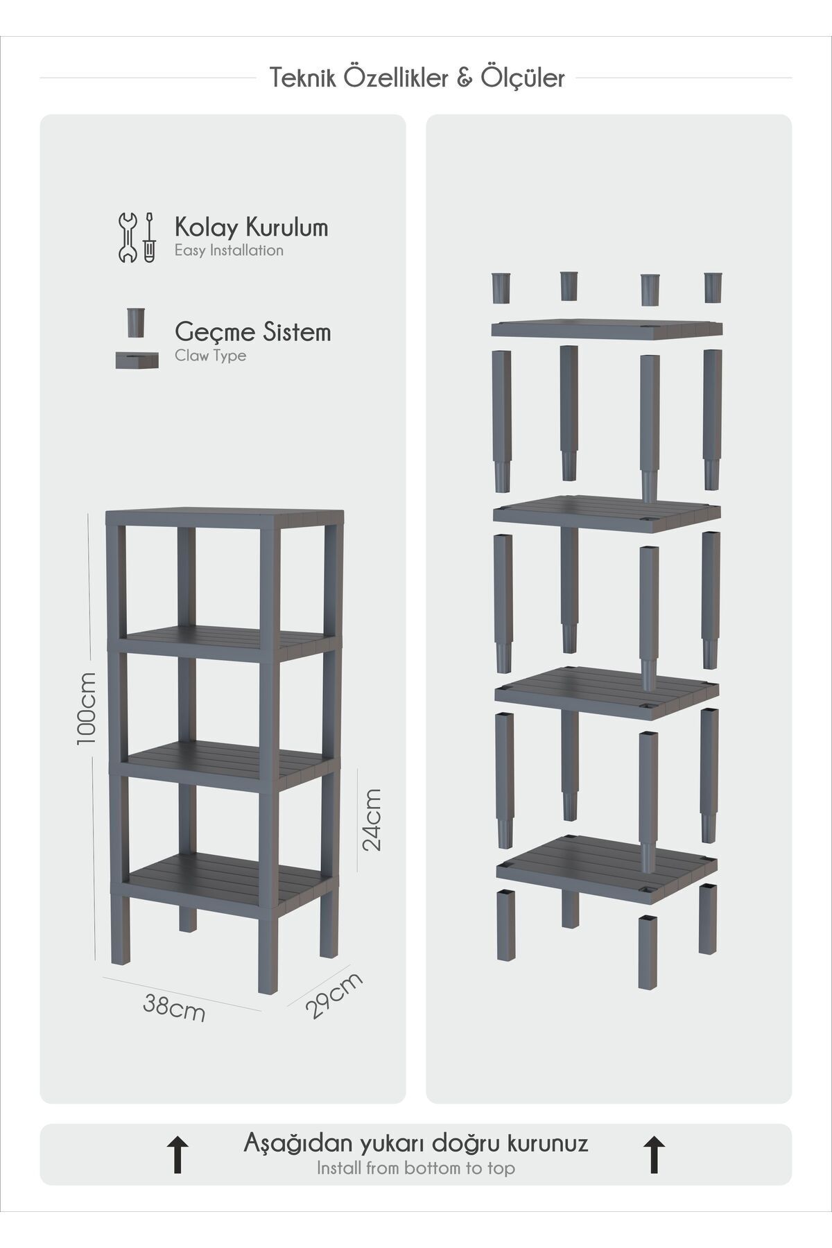 Evinde düzen sevenler, çiçeklerini nasıl dekore edeceğini bilemeyenler, evine sade bir şıklık getirmek isteyenler doğru üründesiniz! Ürünün kurulumu oldukça basittir ve eğlencelidir. 4 raf, 12 adet bağlantı parçası ve 4 adet ayaklar bir kutu içerisinde demonte olarak gönderilmektedir. Ürünü dilediğiniz şekilde monte edebilirsiniz. Kurulum için ürünün kutusunun içerisindeki kurulum şemasından destek alabilirsiniz. Evinizin her alanında; banyo, mutfak, balkon, bahçe, salonda gönül rahatlığı ile kullanabilirsiniz. Yağmurdan, sudan ve güneşten etkilenmez. Antrasit renk gönderilmektedir.