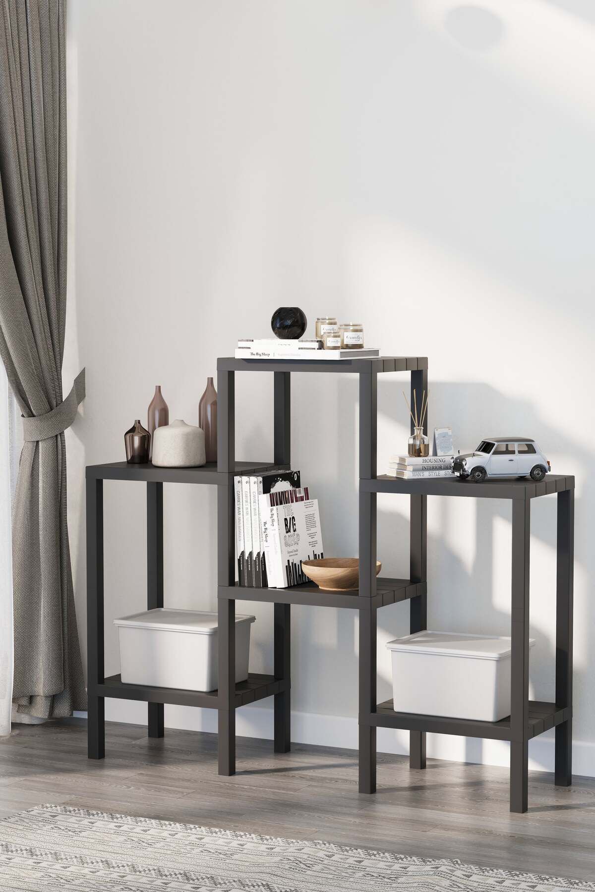 Ombeg Vesken Dekoratif 6 Bölmeli Plastik Çok Amaçlı Banyo Düzenleyici Saksılık Kitaplık Siyah
