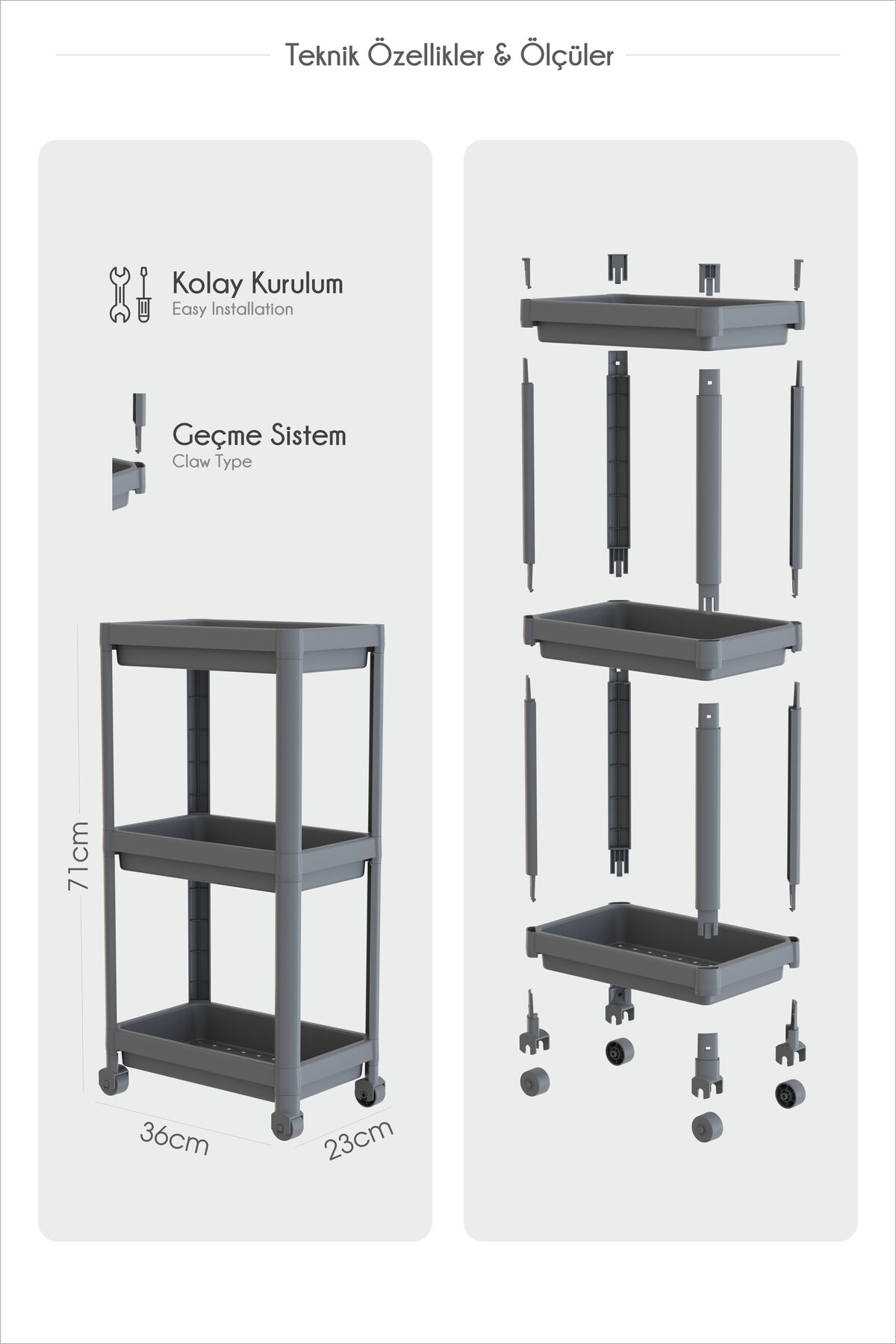 PEGGY 3 Katlı Tekerlekli Raf Ünitesi – Banyo, Mutfak ve Ev Düzenleyici PEGGY 3 Katlı Tekerlekli Raf Ünitesi, çok amaçlı kullanımı, pratik kurulumu ve modern tasarımıyla evinizin her alanında düzeni sağlar.; Kompakt ölçüleriyle dar alanlarda bile maksimum depolama alanı sunar.;