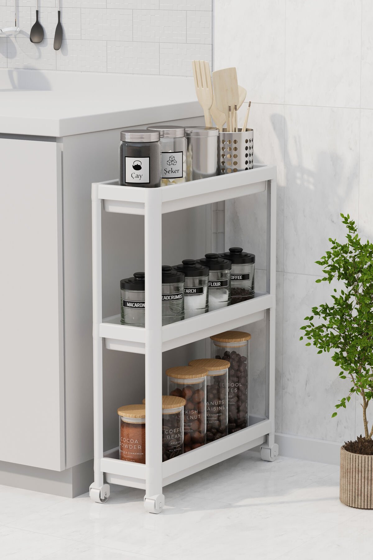 Tekerlekli Dikdörtgen 3 Katlı Raf Ünitesi – Banyo & Mutfak Düzenleyici Organizer Beyaz