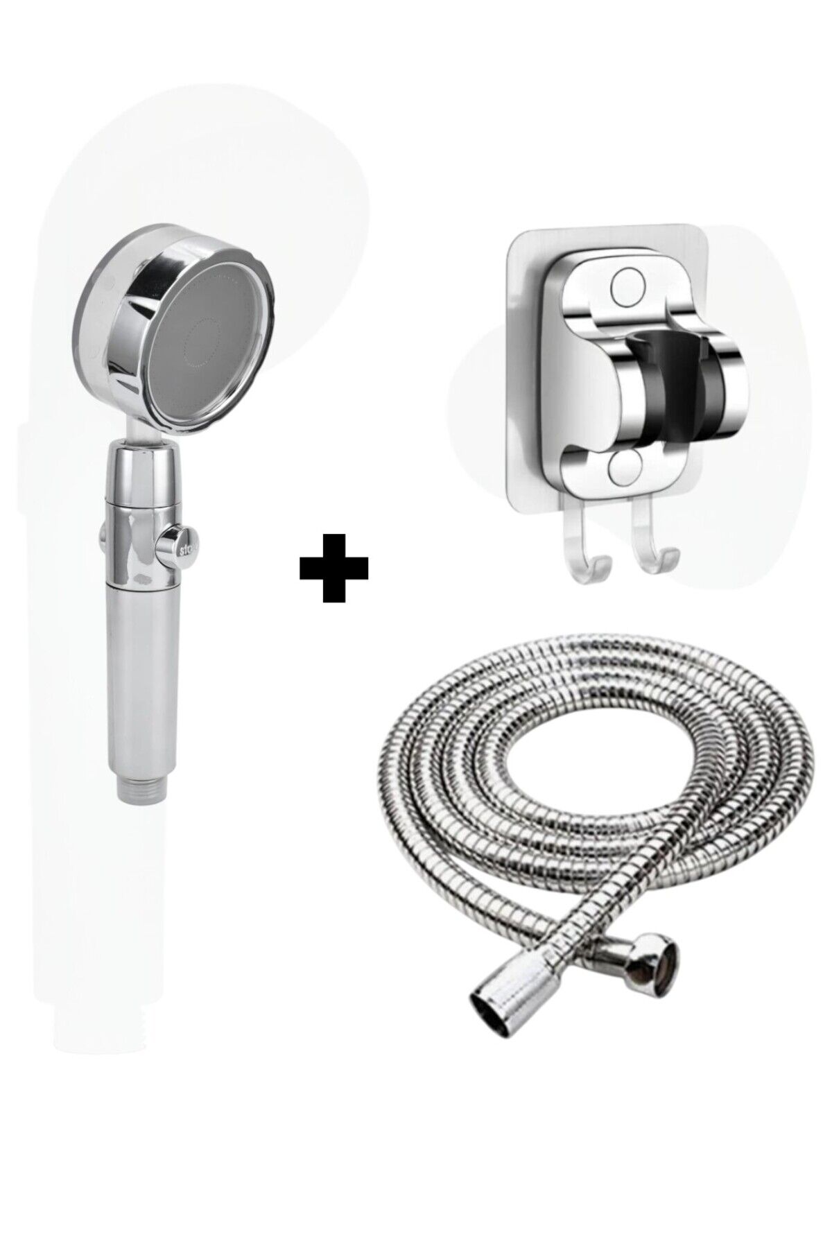 Turbo fanlı 360 derece Gri Duş Başlığı +Kendiliğinden Yapışkanlı Mafsal (Askı) +150 cm Örgülü Hortum