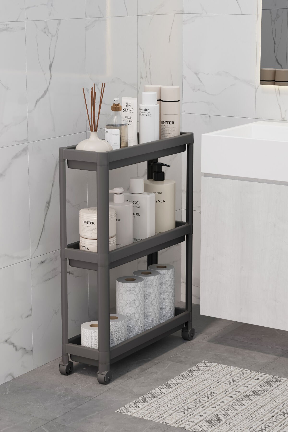 Vesken Çok Amaçlı Siyah 3 Katlı Tekerlekli Dikdörtgen Plastik Banyo Raf Ünitesi